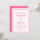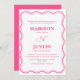 Apresentando o Convite Formal de Casamento Vertro-Cor-de-Rosa ondulada, onde curvas brincalhão em negrito, cores contrastantes encontram uma caligrafia elegante para criar um prazer visual. Essa papelaria moderna e contemporânea expele um charme suave, divertido e caprichoso, perfeito para casais que procuram se afastar do tradicional. Trendy e wavy, este convite promete fazer uma declaração memorável, estabelecendo o tom para uma celebração de casamento única e inesquecível.