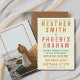 Imprima seus convidados de casamento com esta divertida e ousada convocação de casamento personalizada com foto! O sudoeste inspirou uma tipografia ousada em ouro retrorado, azul empoeirado e rosa-pincel são o sotaque perfeito para sua própria foto ou foto no verso. Você pode personalizar todo o texto e cores para corresponder ao seu próprio evento! Perfeito para um casamento ocidental, praia, moderno, vintage ou destino - este convite único é versátil! Não se esqueça de carregar sua própria foto e verificar os itens correspondentes no conjunto de coleções!