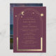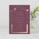 Mística Plum Sun Moon Dourado Stars Astronomy Space Foto Inviting Exibe sol, lua e estrelas com uma estrutura dourada sobre fundo de ameixa. Dentro é a sua informação de convite de casamento. Personalize editando o texto nas caixas de texto e adicionando sua foto favorita. Projetado para você por ©Evco Studio www.zazzle.com/store/evcostudio
