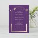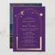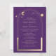 Roxo Místico Roxo Dourado Sol Lua Estrelas Astronomia Espaço Foto Convites de Casamento Apresenta sol, lua e estrelas com uma estrutura dourada sobre fundo roxo. Dentro é a sua informação de convite de casamento. Personalize editando o texto nas caixas de texto e adicionando sua foto favorita. Projetado por ©2022 Evco Studio www.zazzle.com/store/evcostudio