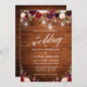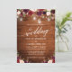 Madeira Rústica, Script de Caligrafia Moderna, Watercolor Burgundy Marsala Convite Floral para Casamento com Rosas Turvas e Rosa. Luzes de Cordas brilhantes com Mason Jars. Foto de volta.