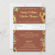 Uma elegante explosão de girassóis contra um pano de fundo de terracota cria uma exibição impressionante e atraente para seus detalhes de casamento. Apresentando delicada caligrafia de script e um lugar para personalizar com você fotos para esse toque especial extra. Perfeito para Primavera, Verão e Casamentos outono!