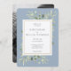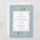 Apresentando folhas de aquarela delicadas em fundo azul na moda poeirento. Este elegante convite de casamento da kraft botânica pode ser personalizado com sua foto e detalhes especiais do dia de casamento na tipografia moderna. Projetado por Thisnotme©