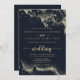 Este convite de casamento de ouro de aquarela é perfeito para um casamento rústico. O design apresenta uma abertura dourada pintada manualmente em um fundo azul escuro. Salve o papel, incluindo mais detalhes na parte traseira do convite em vez de em uma placa de gabinete separada.