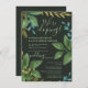 Anúncio de Casamento Fuga Romântica - Convite de Recepção: Folhas de chá pintadas à mão com aquarela com verdejante de jardim botânico em fundo escuro. Tipografia moderna e trendy com campos de modelo de fácil edição. A escolha da fonte, layout e cores podem ser modificados de acordo com o estilo e gosto.