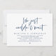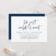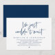 Cartão de convite de casamento com tema azul-marinho moderno, com fuga (simplesmente não podíamos esperar). É perfeito para o seu jantar de recepção de casamento / festa de celebração pós-casamento. Adicione seus detalhes em fonte / letra preta correspondente.