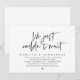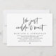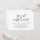 Cartão de convite de casamento com tema de escrita preta moderna, para fuga de casamento (simplesmente não conseguimos esperar). É perfeito para a recepção de fuga de casamento / festa de celebração pós-casamento. Adicione seus detalhes em fonte / letra preta correspondente.