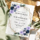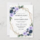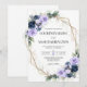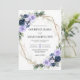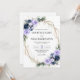Este convite de casamento apresenta flores em roxo lavanda suave e azul-marinho rico, acentuadas com folhagens frescas e uma moldura geométrica dourada moderna. Seus nomes e detalhes do casamento se destacam claramente, emoldurados pela bordadura floral para um visual elegante e romântico.