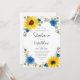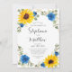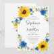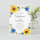 Estes elegantes convites para o casamento apresentam um design de girassol a cores-d'água com rosas azuis, flores do hálito do bebê branco, folhas de eucalipto e uma falsa borda geométrica de ouro sobre fundo branco. Os nomes da noiva e noiva estão em uma fonte moderna de caligrafia. Personalize-os com o seu texto. Produtos correspondentes disponíveis.