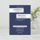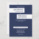 O convite de casamento moderno minimalista apresenta blocos de cores geométricas brancas em azul marinho próximo ao topo, um se estendendo da esquerda e o outro da direita que contêm o primeiro casal, o meio e os sobrenomes em texto de marinho. Um terço acima do fundo há um bloco branco menor com a data em texto azul escuro. As informações de saudação, hora e local estão em texto branco sobre o fundo azul do marinho. Personalize os detalhes na barra lateral. A parte de trás do convite é azul escuro com uma série de listras brancas que não se estendem até o final em um padrão ondulante. © Claire E. Skinner, Todos Os Direitos Reservados.