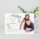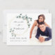 Cartões de save the date de casamento com moldura geométrica dourada e eucalipto trendy em aquarela com dólar de prata e foto.