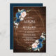 Convite de casamento geométrico, azul-escuro, azul-marinho, com elegante buquê de azul-marinho, azul-real, branco, rosa e verde-sábio, folhas de eucalipto e elegante quadro geométrico neutro de brilho no fundo da madeira rústica. Entre em contato comigo para obter ajuda sobre a personalização ou se você precisar de outro produto com este design.