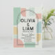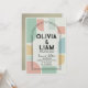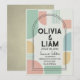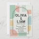Defina o tom da sua celebração única com este convite de casamento geométrico moderno de meados do século que chama a atenção. Com uma paleta vibrante, porém sofisticada, de verde menta, pêssego suave e amarelo mostarda, este design combina inspiração retrô com estilo contemporâneo. O layout apresenta formas abstratas ousadas e uma moldura dupla-arqueada impressionante que destaca elegantemente seus nomes e detalhes do evento.