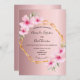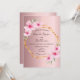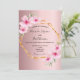 Um convite para o casamento tropical de verão elegante. Com uma falsa estrutura geométrica de ouro decorada com hibisco de rosas claro, flores tropicais com um pouco de verde. Um fundo metálico rosado e sujo. Os nomes da noiva e do noivo são escritos com um moderno roteiro de estilo. Texto preto. Traseira: fundo metálico rosado e rosado.