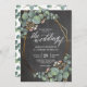 Este é um belo convite de casamento com o quadro de chalkboard eucalipto e design de moldura geométrica dourada. Inclui-se um fundo correspondente com o padrão das folhas de eucalipto.