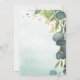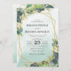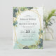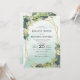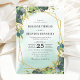 Convites de casamento com eucalipto apresentando um fundo rústico desbotado de aquarela desbotada, uma forma geométrica brilhante dourada, folhas botânicas verdes elegantes, respingos de folha dourada falsa e um modelo de casamento simples que é fácil de personalizar.