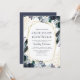 Convites de casamento azul elegantes com um fundo branco moderno que pode ser alterado para qualquer cor, flores de aquarela azul boho rústicas, uma moldura geométrica dourada, brilho dourado e um modelo de casamento moderno.