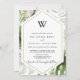 Este convite de casamento de monograma tropical de ouro geométrico é perfeito para um casamento moderno. O design apresenta ouro de aquarela pintada à mão e palmeiras verdes e folhas de bananeiras com flores cor-de-rosa amontoadas em buquês, enfeitando um quadro geométrico.