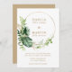 Um convite de casamento botânico moderno com seus nomes dentro de um círculo geométrico cercado por uma aquarela pintada de verde tropical e folhas de ouro falsas. Seus detalhes e fundos estão em um tom dourado correspondente. Estes convites elegantes são perfeitos para um casamento de destino de verão numa área tropical.