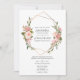 Convite para casamento de cor d'água, cor-de-rosa e rosa, cor-de-rosa esmagada e rosa de ouro com acentos de verde sábio adornando um quadro geométrico dourado.