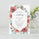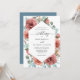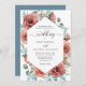 Aprecie amigos e família com este belo convite floral. Seus detalhes de casamento mostrados em uma estrutura geométrica cercados por delicadas flores de aquarela pintadas à mão e folhagem em blush, rosa empoeirado, marfim, pêssego, azul de ardósia nublada, cinzas e tons de sábio. Romântica e elegante ardente/turva fundo azul poeirento. Parte da nossa coleção de casamentos e eventos "Eetéal" Dusty Blue.
