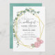 Trendy geométrico eucalipto verde e rosas cor-de-rosa pinceladas convite para casamento com moldura geométrica dourada e lavagem de cor d'água da menta inversa.