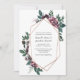 Moldura geométrica de ouro rosa rodeada por flores aquáticas e verde-verde em cores de burgundy, cinza e verde-negro. A parte de trás do cartão é burgundy. As caixas de texto são fáceis de personalizar com suas próprias informações.