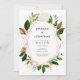 Convite de casamento de cor de água verde com quadro geométrico rosa dourado. Os florais cor-de-rosa pincelados e a lavagem com aquarela complementam o design.