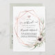 Convite online de cerimônia virtual de casamento de longa distância, com flores anêmonas e folhas de eucalipto em um quadro geométrico de ouro rosa.