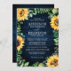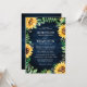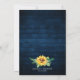 Convite de casamento rústico country com flores de girassol amarelo brilhante e moldura floral de respiro de bebê / gypsophila com folhas em fundo de madeira de celeiro azul marinho. Perfeito para um casamento de estilo country no verão ou outono.