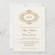 Este convite de casamento glamouroso apresenta um fundo branco cremoso projetado com uma aparência de textura áspera. Uma moldura ornamentada e vintage em falso cobre assenta por cima com as suas iniciais no centro, e o texto do convite aparece numa cor de cobre correspondente.