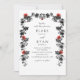 Aprecie seus convidados com este elegante convite de casamento preto e vermelho com lindas terras botânicas florais desenhadas por mão fina com folhas em preto e vermelho, e flores vibrantes de cor vermelha, moldando seus detalhes. Capacidade de alterar e personalizar todas as seções de texto para atender às suas necessidades. Fácil de preencher modelo. Design elegante, romântico e humorístico. Se necessário, você pode selecionar o botão "Editar usando a ferramenta Design" localizado no final das caixas de texto modelo e fazer alterações no estilo, tamanho, cor e posição do texto. Voltar com detalhes botânicos com iniciais de casais. O mesmo convite de volta em preto também está disponível. Parte de nossa coleção "Black and White Enchanting Garlands" com uma variedade de produtos coordenadores disponíveis. Visite a coleção inteira em: https://www.zazzle.com/collections/black_and_white_enchanting_garlands_collecti-119853596760425870