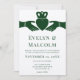 Estes convites de casamento têm uma ilustração simples feita à mão de um coração de claddagh irlandês tradicionalmente encontrado nos anéis de cladagh. O gráfico está em um caçador escuro ou conjunto verde florestal contra um fundo branco. Corresponder a carta elegante está pronto para ser personalizado com seus detalhes de casamento. O lado dos restaurantes desses convites é uma coordenação da cor verde-escura.