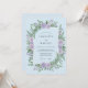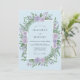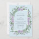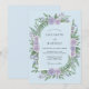 Este design apresenta um arranjo de aquarela exuberante de rosas lavanda e samambaias verdes vibrantes contra um azul suave em pó. Os elementos botânicos criam uma atmosfera serena e romântica, perfeita para um evento florestal na primavera. A paleta de cores combina pastéis frios com verdes folhosos ricos para uma estética graciosa.