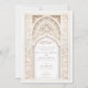 Este luxuoso convite para o casamento é uma mistura perfeita da arte tradicional islâmica e da elegância moderna. Na parte da frente do convite está um intrincado padrão floral de ouro e marfim, que deliciosamente enquadra o texto em árabe e inglês. O belo design de arco, adornado com detalhes de motivos florais e padrões geométricos, expele um senso de grandiosidade e sofisticação. O verso do convite prossegue esse tema com um fundo bege suave, destacado por um ornamentado floral gravado, que adiciona textura e profundidade. Ideal para um grande e elegante casamento, este convite deixa uma impressão duradoura para os seus convidados.