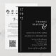 Este convite de casamento, elegante e minimalista, foi feito tendo em mente a elegância contemporânea. Ele apresenta um esquema de cores preto-e-branco ousado, que oferece uma aparência impressionante e eterno misturando linhas limpas com um toque de glamour. Adicione o URL do seu site de casamento que atualizará o código QR (ou exclua-o se não for necessário). O design também inclui uma linha cronológica personalizável de eventos, completa com ícones ajustáveis para se adequar à sua celebração exclusiva. Perfeito para casais que desejam uma ambição moderna e na moda para o seu dia especial. Você pode mudar o texto e a cor de fundo para corresponder ao esquema de cores do dia do casamento, se desejar. Clique em personalizar/personalizar para edição adicional.