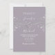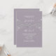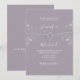 Convite de casamento lavanda roxo elegante moderno simples com caligrafia, corda prateada em forma de coração e renda floral dourada.