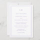 Convite de casamento roxo / lavanda clássico com um simples e mínimo design com seu monograma no topo e seus detalhes de evento cercados por uma dupla borda. As fontes se alternam entre um script elegante, um serif tradicional e fontes sans serif minimalistas. A parte traseira tem seus detalhes de convidado junto com um Código QR opcional (se preferir, você pode remover o Código QR na ferramenta de edição de design). Este convite é excelente para um casamento formal.