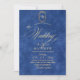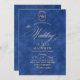 O elegante convite de casamento azul-na moda e ouro moderno, com uma elegante fonte manuscrita com caracóis e um monograma da noiva e do noivo. Clássico e elegante, simples e moderno convite.