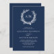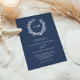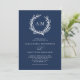 Perfeito para a praia e casamentos náuticos temáticos, uma coral enrola os monogramas da noiva e do noivo no topo desse elegante e mínimo marinho convite litoral azul com texto branco.