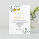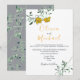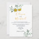 Convite de casamento minimo floral amarelo simples e moderno, com uma combinação elegante de verde e a cor cinza da moda. Convite perfeito para uma cerimônia de casamento íntimo e único.