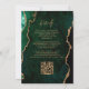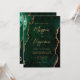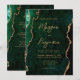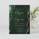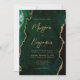 Este convite de casamento elegante apresenta uma imagem de fundo de ágata em aquarela verde-esmeralda decorada com brilho dourado falso. O texto personalizável combina escrita moderna dourada, copperplate e fontes itálicas. O verso fornece espaço para detalhes do casamento em um fundo de ágata verde correspondente, juntamente com um código QR que os convidados podem digitalizar para visitar seu site e responder, o que economiza o custo de impressão e envio de cartões de resposta separados.
