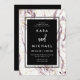 Convites de casamento modernos e elegantes com um fundo de mármore roxo e branco e lascas de ouro falso espalhadas. A área central contém uma moldura preta escura estilosa com a redação do convite em tipografia branca da moda.