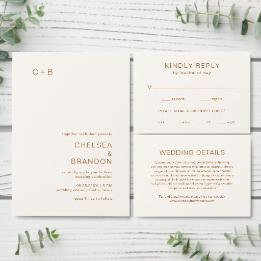 Convite Moderno de Casamento com um layout simples e minimalista com seu monograma no canto superior esquerdo e seus detalhes de casamento no canto inferior direito. Todos os elementos de design estão em terracota / laranja queimada / ferrugem / cobre sobre um fundo de marfim e podem ser alterados na ferramenta de edição de design. Este convite para o casamento com um design mínimo, mas elegante, com tons de terra natural vai bem com qualquer estilo de casamento boho.