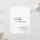 Um convite para casamento preto e branco moderno, com um design simples e mínimo com o nome da noiva em um roteiro elegante e o nome do noivo em uma fonte sans serif contemporânea. Abaixo, no canto inferior direito, estão os detalhes do evento em um layout minimalista.