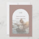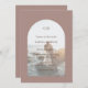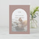 Convite moderno de casamento, com seu monograma junto com seus detalhes sobre sua dentro de foto favorita de um arco sobre um fundo esticado. O modelo inclui uma camada para permitir que o texto apareça sobre a sua imagem e possa ser removido na ferramenta de edição de design. Esta simples, mas elegante design com cores do deserto terrestre é excelente para um casamento estilo boho.