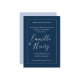Tipo elegante branco sobre fundo azul escuro na frente e fundo azul-piscadela doce no fundo, perfeito para um casamento moderno ou tradicional. Esta design também está disponível em outras cores na minha loja. Clique no botão "Personalizar" para personalizar este convite. Você também pode clicar no link "Clique para personalizar mais" para modificar os textos, incluindo fontes, tamanhos e cores. Itens correspondentes estão disponíveis na minha loja. Clique no botão "Contato" se precisar de assistência para personalizar ou se não conseguir encontrar o que está procurando.