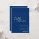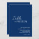 Marinho moderno azul, tudo em um convite de casamento com um simples e mínimo design com o nome da noiva em um roteiro elegante e o nome do noivo em uma fonte sans serif contemporânea. Abaixo, no canto inferior direito, estão os detalhes do evento em um layout minimalista. A parte traseira tem seus detalhes adicionais e o Código QR, para que você possa ignorar a placa do compartimento e a placa RSVP.