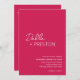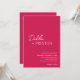 A moderna Viva Magenta cor-de-rosa, tudo em um convite de casamento, apresentando um design simples e mínimo com o nome da noiva em um roteiro elegante e o nome do noivo em uma fonte sans serif contemporânea. Abaixo, no canto inferior direito, estão os detalhes do evento em um layout minimalista. A parte traseira tem seus detalhes adicionais e o Código QR, para que você possa ignorar a placa do compartimento e a placa RSVP.