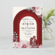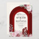 Este convite de casamento muçulmano, lindamente desenhado, apresenta um arco vermelho profundo acentuado com padrões florais delicados, misturando elementos tradicionais com elegância moderna. Destacando os nomes do casal, o convite reflete calor e sofisticação, perfeito para uma celebração alegre.